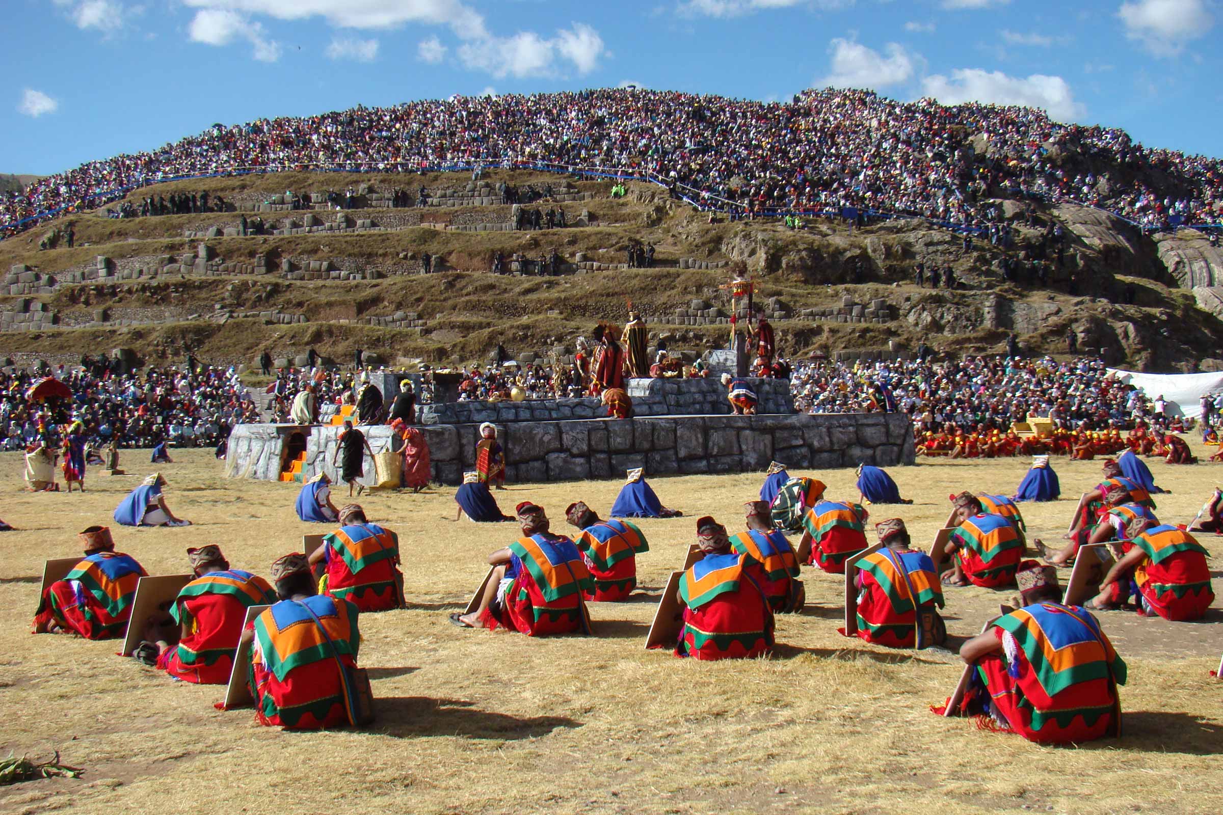 Plaza de Armas (llamada por los Incas “Auqaypata”, la Plaza del Guerrero), que fue una plaza enorme durante la época de los Incas donde se realizaba esta ceremonia sobre una plataforma ceremonial (“ushnu” en quechua). A partir de ahí, el Inca fue llevado en un trono de oro encabezando una procesión a través de la antigua ciudad de Cusco hasta Sacsaywaman en las colinas de la ciudad.